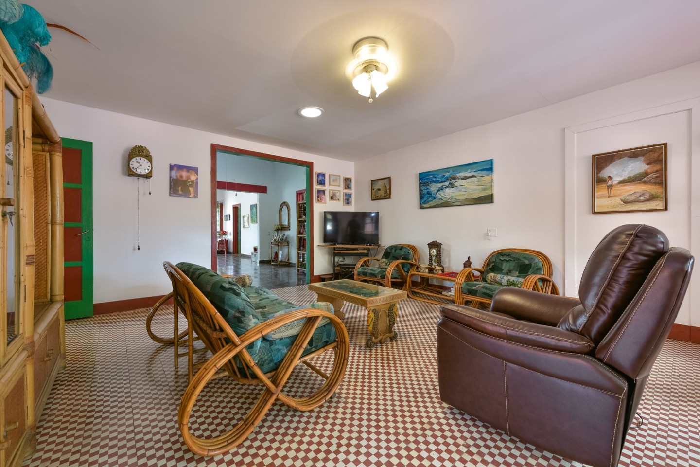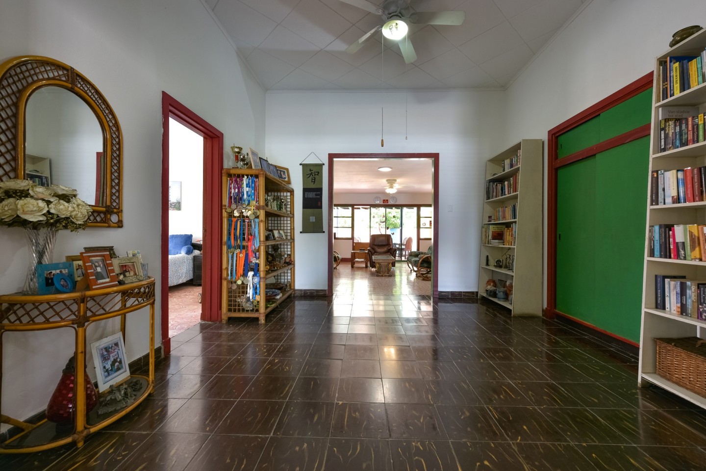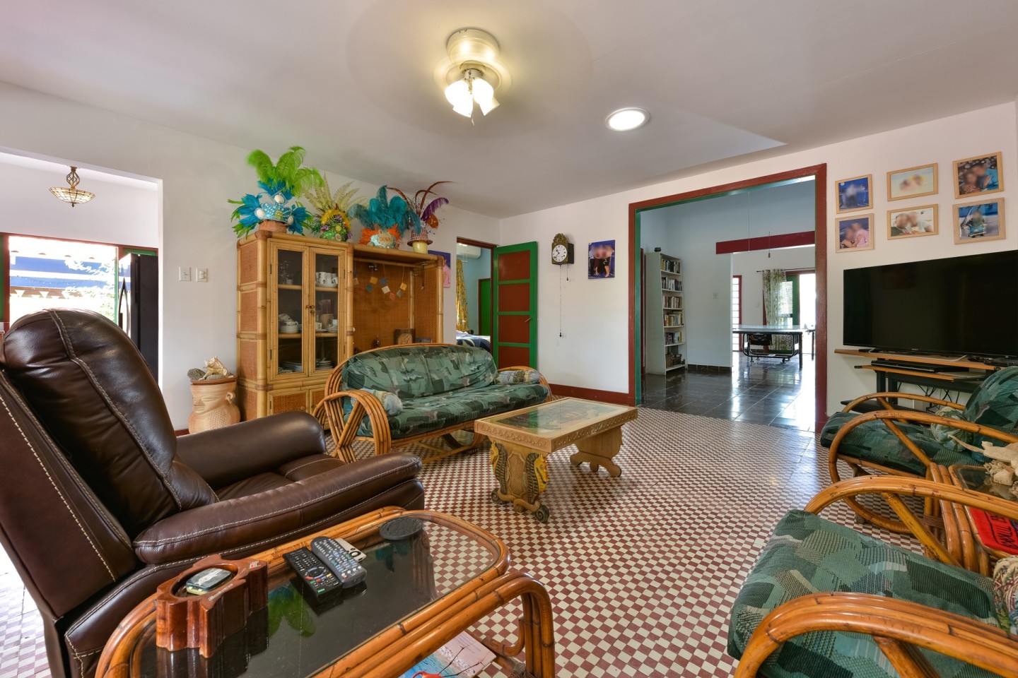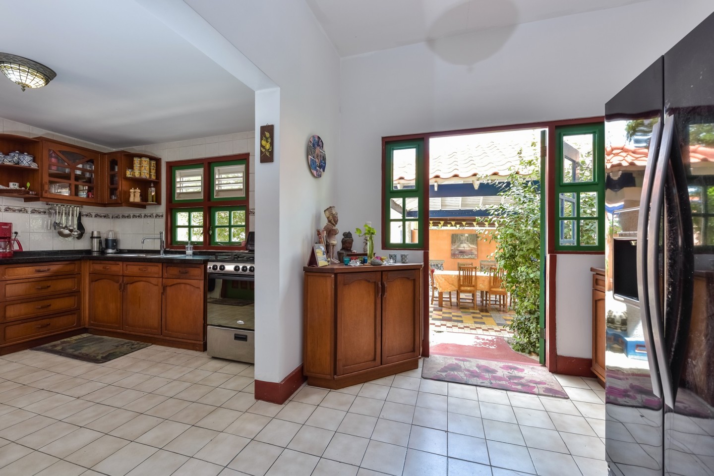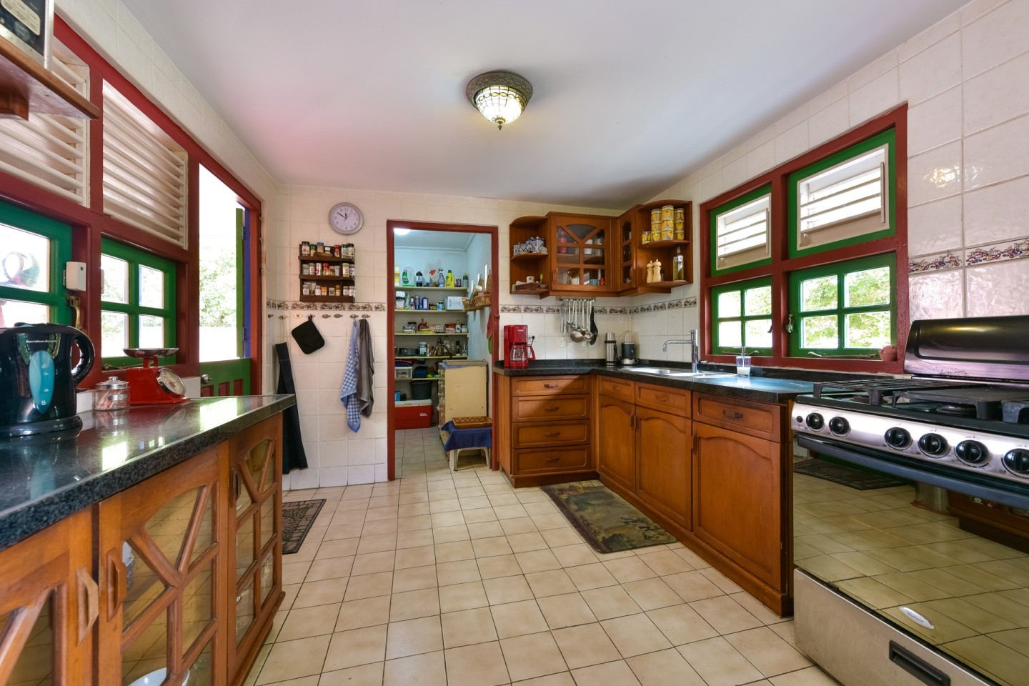 Overlooking this property, the first thing you will notice is the spacious side yard with garage. Upon entering the home, the well-kept front garden greets you with lush greenery and a unique island flair. The vast double entryway leads you into the living room which features sliding doors out onto the covered patio with seating. Find the well equipped kitchen next to the living room with stainless steel appliances, dark granite countertops and adjacent pantry. The main residence has 3 guest bedrooms, 1 shared bathroom as well as a spacious master with built-in closets and en-suite bathroom. There's a maid's quarters with private bathroom, laundry room and extra storage space attached to the home.
