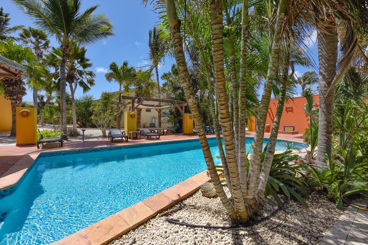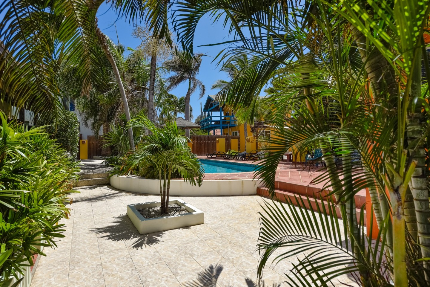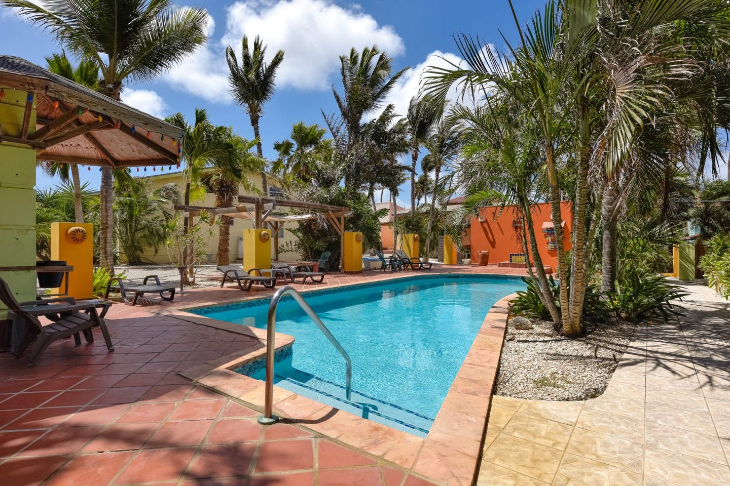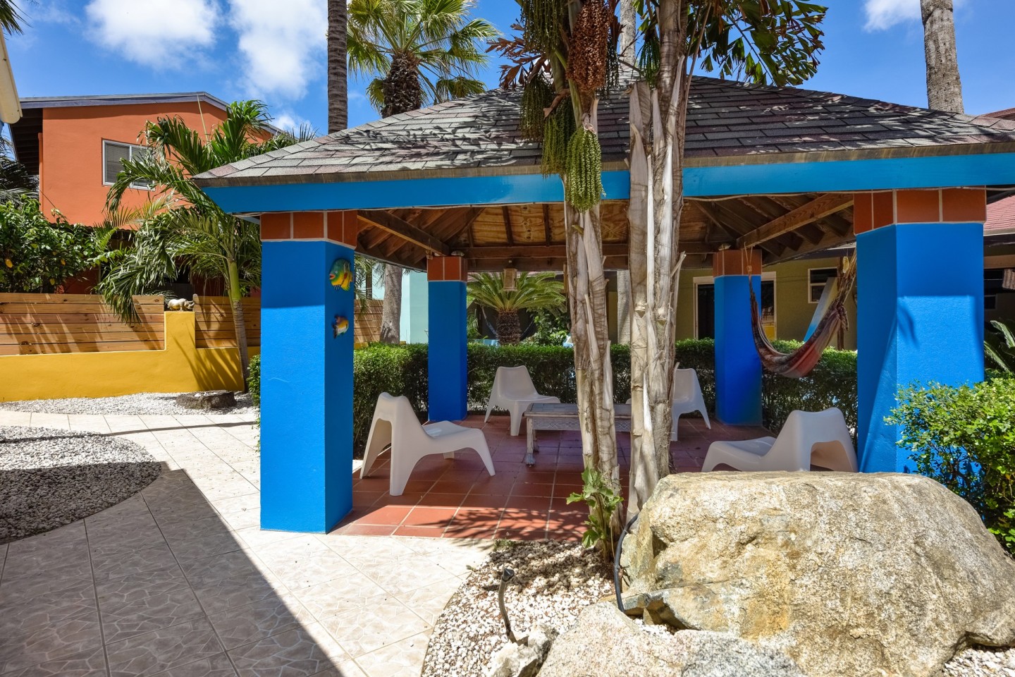 The lush tropical garden has several gazebo's; the perfect spot to relax and unwind. The large swimming pool is on the parcel of Papaya 9-K and conveniently located between the buildings. A laundry room can be found there as well.