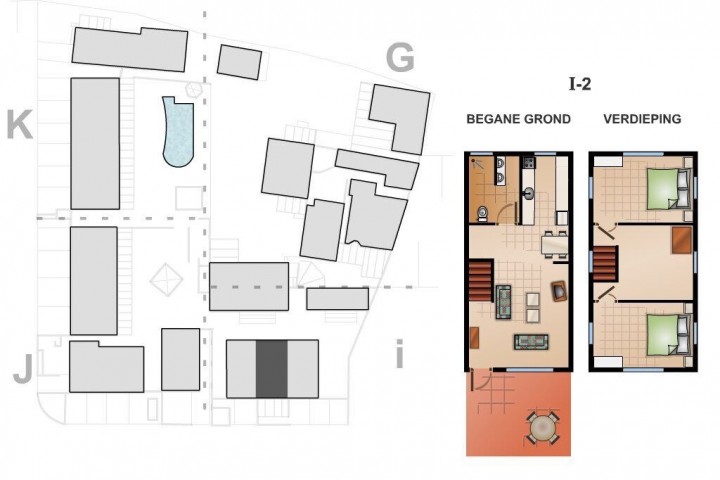 The building complex has two two-bedroom apartments and four one-bedroom apartments. Each has a porch, a living room, a kitchen with dining room, a bathroom and has one or more bedrooms. The home has a total build-up area of 115 m2.